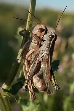 Melanoplus bivittatus participate in long hours of mating, with some copulation lasting up to 10 hours.[6] The mating rituals of M. bivittatus are similar to that of red-legged grasshoppers (Melanoplus femurrubrum) in that both species receive and obtain nuptial gifts, in this case spermatophores[6] Spermatophores are provided during the entire copulation period, which tends to be dominated mostly by male activity.[6] Long periods of copulation are productive for sperm and nutrient transfer.[6] Once the females have mated with a male they usually become receptive to remating within four days, but may wait up to 21 days.[6] Females will often refrain from rejecting males due to the benefits gained from the protein and fitness from eating the spermatophore.[6]