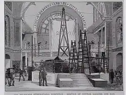 After being granted self-governance, Victoria (in 1851) and New South Wales (in 1856), saw a steady economic growth as a result of the discovery and exploitation of gold reserves. This growth during the 1850s and 1860s led to rivalry between their respective capitals Melbourne and Sydney. In the 1870's the focus turned to the outside world and proposals were made for organising an exhibition modelled on the great exhibitions of Europe, with an aim to promote commerce and industry, along with art, science and education. Melbourne started preparations in 1879 and filed a plan to the Parliament. Melbourne's rival Sydney, the older of the two cities, wanted to be the first and organised an exhibition in record time.[1] This Sydney International Exhibition started in October 1879, but it focused mainly on agriculture, so it was not really universal and therefore did not meet the criteria for official recognition by the BIE. Melbourne decided to start their exhibition shortly after the one in Sydney, so the participants could transport their exhibits during the winter of 1880.[2]