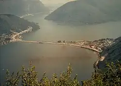 Today the causeway carries the Gotthard railway, the A2 motorway, and a main road. A bridge within the causeway permits water flow and navigation between the two halves of Lake Lugano. The causeway makes use of a submerged glacial moraine, which stretches across the lake reducing its depth to around 10 metres (33 ft), as opposed to the lake's maximum depth of 288 metres (945 ft).[1][2]