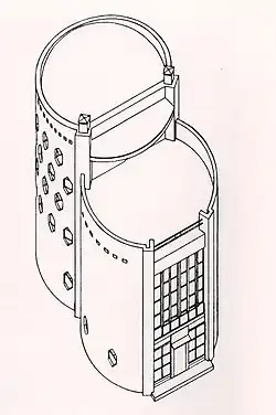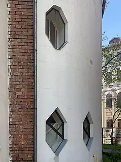 The house walls are made of red brick with a patterned masonry that creates an openwork frame. The masonry was carried out according to the design with a shift along the wall in a row and across the wall in two rows. As a result, 124 hexagonal openings were formed in the outer walls of the house, according to Melnikov himself.[4] Other sources suggest that the walls originally contained "about 200"[5] or 100 openings.[13] During construction, almost half of the openings were filled, leaving 64 for windows and niches. The original wall framework allows for the relocation of window openings without compromising the load-bearing structures. New windows can be built almost anywhere in the wall and existing ones can be closed if necessary. During construction, loose sand, clay, and broken bricks were used to fill unnecessary openings. This reduced construction costs and saved materials. Additionally, the high air content between the particles in this mixture allows it to function as a 'heat accumulator', with lower heat dissipation compared to bricks. According to the architect's own calculations,[14] his proposed design reduced brick consumption by almost half compared to conventional masonry with the same load-bearing capacity. Additionally, Melnikov's masonry system ensured even stress distribution throughout the wall and eliminated the need for load-bearing pillars and lintels.[4]