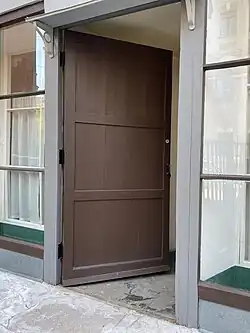The entrance. To the left of the entrance is the dining room window, to the right is the front room window. July 2020 - The dining room (17 m2) is the main room on the first floor, where the family gathered, dined and received guests. It is lit by one hexagonal opening and a large rectangular window to the left of the entrance to the house.