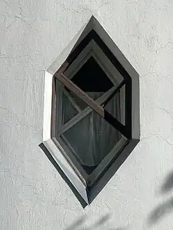 Front door | Pattern of the hexagonal window on the first floor of the northern cylinder | Windows on the west side of the smaller cylinder. Upper window, the only octagonal window in the house. |