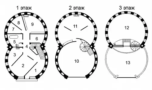- The original plan did not include a basement floor with a calorifier in order to save money. The stove was intended to be placed in the centre of the second floor, which greatly limited Melnikov's room layout options. However, during construction, the wall foundations of the previous pre-revolutionary house were discovered. During the construction process, a small cellar was incorporated under the front cylinder, which could accommodate a 14 m2 calorifier chamber. This allowed the architect to create a free plan for the first floor.