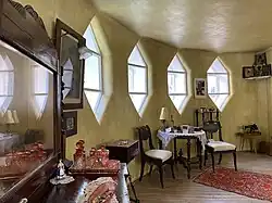 The entire third floor was occupied by Melnikov's workshop (50 m2), where he worked. Later, his son Viktor Melnikov took over the workshop on the third floor to pursue his career as a painter, while the living room was converted into K. S. Melnikov's office.[21] The workshop and drawing room are nearly identical in terms of area and height. However, visitors perceive them in completely different ways.[22] The drawing room has a single, large window, while the workshop is illuminated by 38 hexagonal windows that form a complex ornamental pattern. Additionally, the drawing room has a glazed door leading to the south-facing terrace. The workshop's lighting method created an unusual appearance and provided optimal lighting conditions for the architect's workplace. The light came from all sides, preventing the hand from shading the drawing.[3]