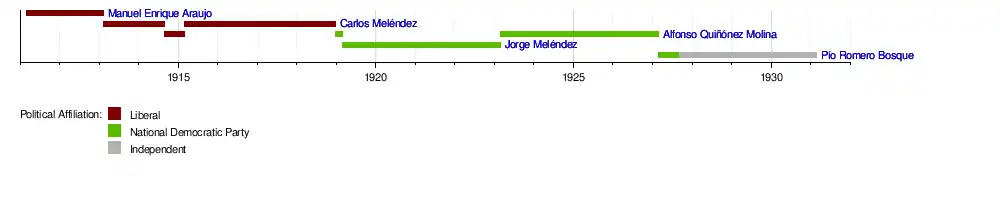 The following graph visualizes the timeline of the presidencies of the Meléndez–Quiñónez dynasty, as well as those of Manuel Enrique Araujo (whose assassination led to the dynasty's rise) and Romero (whose policies ended the dynasty's influence). In total, the dynasty ruled El Salvador for 14 years and 20 days from 9 February 1913 to 1 March 1927.