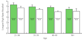 ![]() This is a graphical representation of typical results that might be obtained from performing a forward/backward digit span recall task on participants in several different age groups. The numbers on the y-axis indicate number of digits successfully recalled. | |