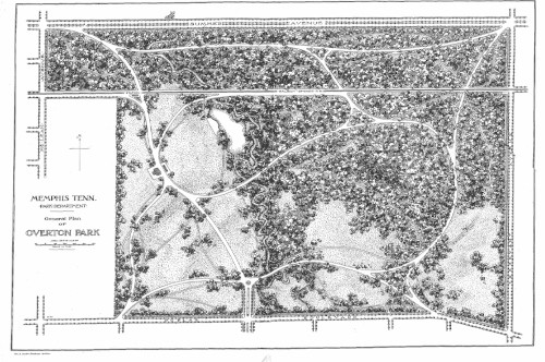 Kessler's plan for Overton Park. North Parkway is to the north (labeled Summer Avenue) and East Parkway is to the east (labeled Trezevant Street).