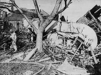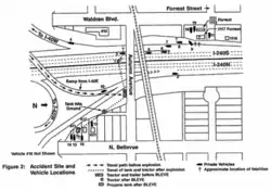 The vehicle involved in the accident was a 1986 Mack Econodyne tractor towing a 10,450-US-gallon (39,600 L) steel tank manufactured in 1964, loaded with 9,511 US gallons (36,000 L) of pressurized liquified propane. On December 23, 1988, at approximately 10:15 a.m. Central Time, the semi-trailer truck skidded off a ramp carrying traffic on I-40 eastbound at the Midtown interchange in Memphis, rolled about 1 1/4 times, and crashed into a retaining wall at the base of an overpass.[11][12] The crash punctured a small hole in the front end of the tank. Leaking propane quickly enveloped both sides of the interstate in a vapor cloud, which ignited seconds later in a boiling liquid expanding vapor explosion (BLEVE) which produced a fireball estimated to be about 700 feet (210 m) wide and 700 to 800 feet (210 to 240 m) tall.[13] This set nearby vehicles and buildings on fire and instantly killed five motorists, including the driver of the truck.[14][15] The tank was then propelled from the highway by the remaining rapidly escaping and combusting gas inside of the tank, causing it to strike a nearby overpass bridge before exiting the freeway right-of-way, bouncing off the ground, striking the top of a tree, and crashing into a duplex about 125 yards (114 m) away from the crash site. This instantly killed an occupant of the complex and started a fire which subsequently spread to multiple other buildings and cars.[16] As the tank became airborne, most of the tractor was propelled into the southbound lanes of I-40.[11] Other parts of the truck, including tires and an axle, were hurled from the crash site into nearby homes. The crash created a traffic jam that extended several miles in all directions, and about one hour after the crash, a truck on I-240 northbound crashed into stopped vehicles at the south end of the traffic congestion, killing the driver.[17] In addition to the truck, seven cars were completely destroyed by the explosion.[11] Ten other cars, seven houses, and one industrial building were damaged by the explosion and subsequent fires.[16][11] Ten people were injured, and two people who were inside homes impacted by the crash died the following day from their injuries.[18] Several of the injured were treated for severe burns, and some of the deceased victims were burned beyond recognition.[19]