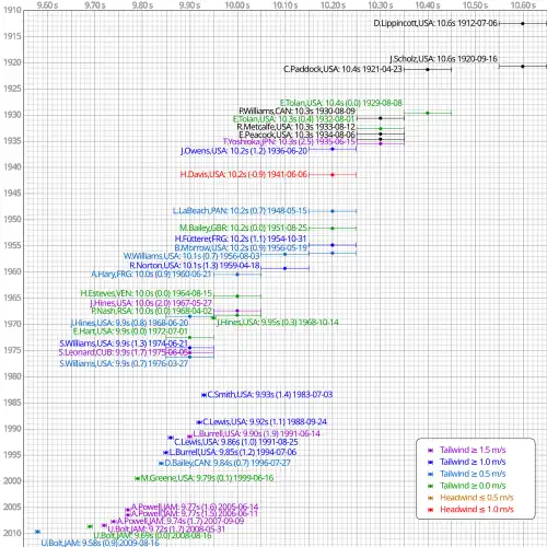 Jim Hines' October 1968 Olympic gold medal run was the fastest recorded fully electronic 100 metre race up to that date, at 9.95 seconds.[2] Track and Field News has compiled an unofficial list of automatically timed records starting with the 1964 Olympics and Bob Hayes' gold medal performance there. Those marks are included in the progression.