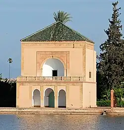 The 19th century pavilion or menzeh, built in stone,[13][4] has a rectangular floor plan, two floors, and is topped by a pyramidal green-tiled roof. It has been described as a classic example of royal pavilion architecture in Morocco during the Alaouite period.[3]: 532 [4][12] The first floor, which was functional and used for domestic purposes, consists of a large room between four heavy pillars, plus an exterior triple-arched portico that projects northwards and opens onto the edge of the artificial lake. An entrance doorway is also located on the south side of the building. The upper floor is reached via a steep straight staircase. This upper floor consists of a large square room, with a low rectangular door that leads to a rectangular balcony on its north side on top of the projecting ground-floor portico. The low door was possibly made this way to prevent public onlookers below from seeing inside the building when it was open. The staircase to the upper floor also continues to the roof, where a much smaller balcony on the south side provided views over the orchards and towards the Atlas Mountains. The pavilion is also set inside its own small garden area enclosed by its another wall, separating it from the rest of the public grounds around it.[3][13][4]