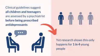 According to National Institute for Health and Care Excellence (NICE) guidelines, antidepressants for children and adolescents with depression and obsessive compulsive disorder (OCD) should be prescribed together with therapy and after being assessed by a child and adolescent psychiatrist. However, between 2006 and 2017, only 1 in 4 of 12-17 year olds who were prescribed an SSRI by their GP had seen a specialist psychiatrist and 1 in 6 has seen a paediatrician. Half of these prescriptions were for depression and 16% for anxiety, the latter not being licensed for treatment with antidepressants.[41][42] Among the suggested possible reasons why GPs are not following the guidelines are the difficulties of accessing talking therapies, long waiting lists and the urgency of treatment.[41][43] According to some researchers, strict adherence to treatment guidelines would limit access to effective medication for young people with mental health problems.[44]