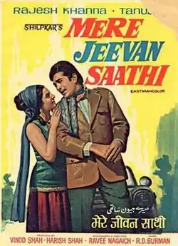 Mere Jeevan Saathi (My Life Partner) is a 1972 Indian film produced by Harish and Vinod Shah. It is directed by Ravikant Nagaich, and it stars Rajesh Khanna, Tanuja, Sujit Kumar, Bindu, Helen,[2] Utpal Dutt, Nazir Hussain and Rajindranath. This movie made at the height of Rajesh Khanna's popularity and craze after the slight fall in 1971. It was the second movie of Rajesh Khanna with Tanuja after the success of Haathi Mere Saathi (1971). Although the movie was a box office superhit grosser upon its release and received all time classics good reviews from viewers and critics, the soundtrack and songs became very popular and are evergreen. "O Mere Dil Ke Chain" and "Chala Jata Hoon" are still very famous Kishore Kumar melodies from this film.