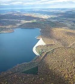 Merrill Creek Reservoir, located in Harmony Township, New Jersey in central Warren County, New Jersey,[1] is a 650-acre (260 ha) artificial lake designed to hold 15 billion gallons of water that is surrounded by 290 acres (120 ha) of protected woodland and fields. These lands are themselves part of 2,000 acres (8.1 km2) of open spaces.