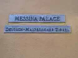 When Count Rosario Messina died in 1875 it fell into ownership of Count Dr Giovanni Messina, who would later become President of the Malta Chamber of Commerce from 1894–1911 and his brother Francesco, also a lawyer who ran a family bank at 141A, St. Christopher Street.[1][4] In 1911, Messina Palace was bequeathed to Giovanni's daughter Maria and to his nieces. When Countess Lucia Messina, wife of Francesco and who benefited from the usufruct on the Palace, left the premises in 1939 during the outbreak of World War II it was requisitioned and used by the Maltese government as a school and then for many years as an Educational ministry building.[1] In 1975, the Palace was leased to the German-Maltese Circle and was purchased by them,[5] with financial aid from the Federal Republic of Germany in 1989.[1][3] They have retained the Messina Palace their headquarters to this day.[6]
