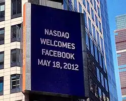 Trading in the stock, which began on May 18, was delayed that day due to technical problems with the Nasdaq exchange.[26] The stock struggled to stay above the IPO price for most of the day, forcing underwriters to buy back shares to support the price.[27] At the closing bell, shares were valued at $38.23,[28] only $0.23 above the IPO price and down $3.82 from the opening bell value. The opening was widely described by the financial press as a disappointment.[29] The stock set a new record for trading volume of an IPO.[30] On May 25, 2012, the stock ended its first full week of trading at $31.91, a 16.5% decline.[31]