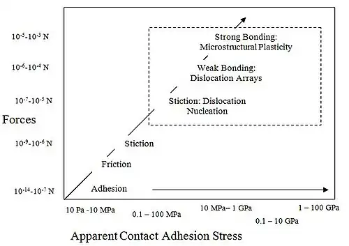 The strength of the bond between the oxide and metal for the same nominal contact area can range from Pa to GPa stresses. The cause of this huge range stems from multiple phenomena dealing with at least four different types of adhesion. The main types of bonding that form adhesion are electrostatic, dispersive (van der Waals or London forces), chemical and diffusive bonding. As the adhesive forces increase, separation in crystalline materials can go from elastic debonding to elastic-plastic debonding. This is due to a larger number of bonds being formed or an increase in strength of the bonds between the two materials. Elastic-plastic debonding is when local stresses are high enough to move dislocations or make new ones.[10]