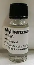 Methyl benzoate is an organic compound. It is an ester with the chemical formula C6H5COOCH3, sometimes abbreviated as PhCO2Me, where Ph and Me are phenyl and methyl, respectively. Its structure is C6H5−C(=O)−O−CH3. It is a colorless liquid that is poorly soluble in water, but miscible with organic solvents. Methyl benzoate has a pleasant smell, strongly reminiscent of the fruit of the feijoa tree, and it is used in perfumery. It also finds use as a solvent and as a pesticide used to attract insects such as orchid bees.