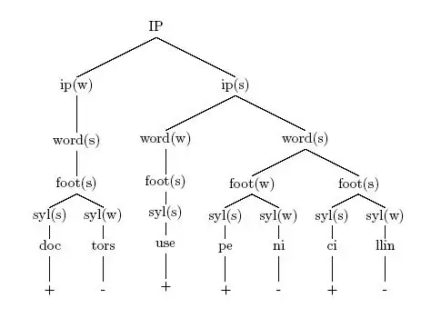 The higher the column of Xs above a syllable, the more prominent the syllable is. The metrical grid and the metrical tree for a particular utterance are related in such a way that the Designated Terminal Element of an S node must be more prominent than the Designated Terminal Element of its sister W node.[2] So in (3), the metrical grid for the utterance in (1), '-ci-' must be more prominent than 'doc-' because '-ci-' is the Designated Terminal Element of the highest S node and 'doc-' is the Designated Terminal Element of its sister W node.