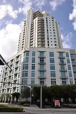 Metropolis at Dadeland is a pair of skyscraper condos in the Dadeland neighborhood of Kendall, Miami-Dade County, Florida, United States.[3] Metropolis at Dadeland consists of two near identical residential towers, Metropolis One and Metropolis Two. The towers provide retail and dining space on the street level, while the remaining floors are residential condo units. Specifically, floors two though seven are loft style units surrounding nine floors of parking. Floors eight through twenty-six are condo units and Penthouse units at the top. Floor eight contains most of the buildings amenities such as two pools, his and her saunas, library/work center, fitness center, club room with pool tables, and a Jacuzzi. Both towers stand at a height (architectural) of 313.58 ft. [4][5]