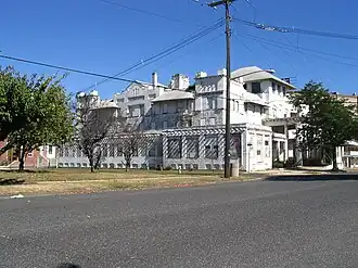 The most recent structure was not the original, although a hotel had operated on the site under this name since the 1880s. The main structure was a Spanish Revival style built in a rectangle, with a four-story hip roof, central pavilion, two-story porticos with fluted Doric columns, and balustrade and enclosed porches. Decorative touches included the stucco surfacing, parapet roof and canales. The metal marquee was a later addition, and there was a newer motel wing on the east side of the property.[2] The motel annex was razed in early December 2009.