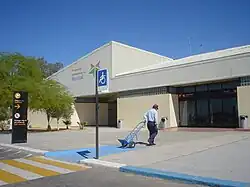 The passenger terminal is a one-story structure that accommodates arrivals and departures, offering standard services typically found at regional airports. These services include parking facilities, a check-in area, security areas, a VIP lounge,[4] retail outlets, immigration, and customs facilities, baggage-claim zones, an arrivals hall with car rental services and taxi stands, and a departure concourse with five gates that provide direct access to the apron, allowing passengers to board their planes by walking to the aircraft.