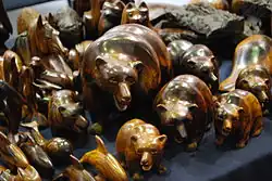 The second group of producers is made up of town and city dwellers from Sonora and Baja California, who began carving after the figures became commercially popular. The latter group produces the figures in grand quantities due to their access to power tools.[2] These families can produce between forty and fifty pieces per day, most of which they sell to wholesalers in Nogales, Sonora. Most of these are then sold in the United States.[3] This has put the Seri at a disadvantage in the market, with their share shrinking. Today there are fewer than fifteen Seri carvers. The carvers total use about 5,000 tons of wood per year for the craft.[2] The development of the carving has been driven by consumer and tourist demand, including the use of asymmetry and abstract forms. Some tourists think a more "primitive" looking carving looks more "authentic" than finer work. Association of the Seri with the craft is still important to its sale and many non Seri falsely put "Handmade by Seri" stickers on their works.[4]