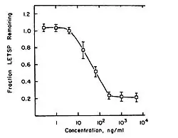 The shape of the fibronectin-decrease curve is more usual, although not quite: the separate parts of the curve are all more or less linear, which is not the case in an S-shaped curve. In this case, a maximum dose can be determined: above concentrations of about 103 ng/mL the effect remains more or less stable. A NOAE-level is visible for concentrations of up to 1 ng/mL of mezerein. The concentration that gives half-maximal effect is approximately 90 ng/mL. The difference with the half-maximal concentration for 2-DG transport is remarkable. Mezerein causes a 46-fold lower effect for fibronectin decrease than for 2-DG stimulation, and apparently only causes this effect at high concentrations. This might also correlate with mezerein being a weak tumor promoter.