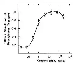 The shape of the 2-DG transport dose-response curve has an optimum at a mezerein concentration of approximately 50 ng/mL. This is atypical, since a dose-response curve usually is S-shaped. The explanation for this behaviour is unknown. Possibly, at high concentrations, mezerein is converted by enzymes that have low affinity for it. That would lower the effective concentration and thus decrease the effects. In this picture, a NOAE-level can be observed between mezerein concentrations of 0 to approximately 0.09 ng/mL. The concentration that gives half-maximal effects is reached for a low concentration of mezerein: about 0.7 ng/mL.