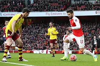 On 3 July 2017, Keane signed for Premier League club Everton on a five-year contract, for an initial fee of £25 million that could rise to £30 million.[39] Keane made his league debut for Everton on 12 August 2017, when his club beat Stoke City 1–0 at Goodison Park.[40] Keane scored his first goal for Everton on 17 August 2017 in the UEFA Europa League play-off round first leg against Hajduk Split. Keane had risen highest at the far post to head in Leighton Baines' left-wing cross. His towering header gave Everton the lead in the 30th minute and the match ended with Everton winning the match by 2–0.[41]