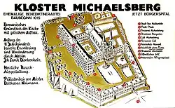 Michaelsberg Abbey or Michelsberg Abbey, also St. Michael's Abbey, Bamberg (German: Kloster Michaelsberg or Michelsberg) is a former Benedictine monastery in Bamberg in Bavaria, Germany. After its dissolution in 1803 the buildings were used for the almshouse Vereinigtes Katharinen- und Elisabethen-Spital, which is still there as a retirement home. The former abbey church remains in use as the Michaelskirche.