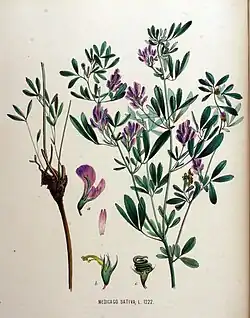 - "Lucern grows naturally with one large perpendicular, or tap-root, which penetrates very deep into the earth, and has few, if any, lateral roots. From similar experiments on other tap-rooted plants, I was induced to think, that this too, by transplanting it, and at the same time cutting off part of its tap-root, might be made to shoot out several horizontal roots, which, reaching into the loose mould of the alleys, and extending themselves there, would collect a greater quantity of nourishment for the plant, and consequently enable it to produce more abundant crops."[16]