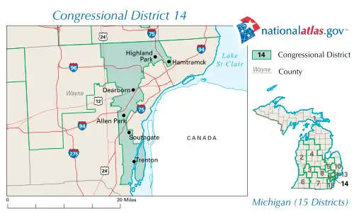 Michigan's 14th congressional district was a congressional district that stretched from eastern Detroit westward to Farmington Hills, then north to the suburb of Pontiac. From 1993 to 2013, it was based entirely in Wayne County.