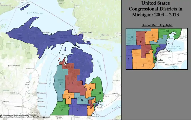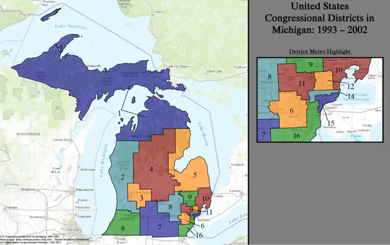 Below is a table of United States congressional district boundary maps for the State of Michigan, presented chronologically forward.[5] All redistricting events that took place in Michigan in the decades between 1973 and 2013 are shown.