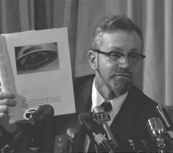 ![]() J. Allen Hynek at a press conference on the Michigan UFO sightings at Dexter and Hillsdale, shown here holding up a magazine featuring the Adamski photograph of 1952, after the magazine was handed to him by a reporter. | |