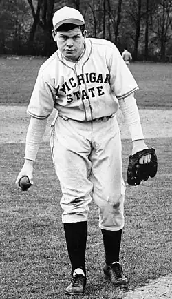 Robin Roberts initially came to East Lansing as part of a United States Army Air Corps training program in 1944. After the war ended in 1945, he took his leave of the service and returned to MSC (the name was Michigan State College at the time) to play basketball. Roberts was twice named captain, earning three varsity letters in basketball.[4] After his second season playing basketball, Roberts tried out for the Michigan State baseball team, becoming a pitcher because it was the position that coach John Kobs needed most. After playing for Michigan State, going 9–6 over two seasons, with 6 shutouts in the 1946 season, he was signed by the Philadelphia Phillies in 1948. Roberts would go on to win 286 games, with 7 Major League Baseball All-Star Game appearances in a 19-year Major League Baseball career. Roberts was inducted into the Hall of Fame in 1976.[5][6]