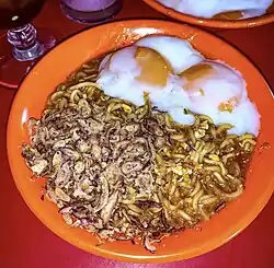 The dish is typically created using packaged commercial instant noodles such as Indomie stir-fried in a sauce of herbs and spices,[3] using a bumbu spice mix such as medok, along with the commercial seasoning packet typically included with the noodles.[4][5][6][7] The additional spices thicken the sauce and give the dish a richer color and flavor than a typical bowl of instant noodles or ramen.[8]