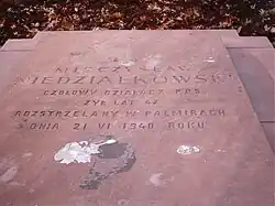Mieczysław Niedziałkowski (September 19, 1893 in Vilnius - June 21, 1940 in Palmiry) was a Polish politician and writer. He was an activist in the Polish Socialist Party, editor in chief of Robotnik, and one of the primary activists and cofounders of the Centrolew alliance. He published several works on socialism and Polish politics. He took part in the defence of Warsaw in 1939 against the Nazi German aggression, organizing the volunteer militias. He was subsequently arrested and interrogated by the German secret police or Gestapo. He was shot dead on 21 June 1940 in Palmiry during the German AB-Aktion.