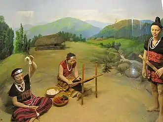 The men wear a narrow waist cloth which is brought up between the legs and hangs down in an embroidered flap in front. Over this is worn a sleeveless coat reaching halfway down the thighs, the lower half of which is embroidered. The coats and the waist cloth are both woven on an ordinary Indonesian tension loom.