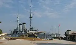 The park is centered around the battleship Mikasa, which was commissioned in 1902, and went on to play a role in Japan's victory in the Russo-Japanese War.[1] In 1924, the ship's commander, Togo Heihachiro, led an "Mikasa Preservation Association" to "cultivate the national spirit" by establishing the park.[3] After the end of World War II, the ship was stripped for parts, and portions were converted to be used as an aquarium, until a successful restoration campaign in the 1960s.[1]