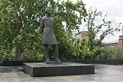 In 1921, in the first year of Soviet rule, one of the central streets of Yerevan was renamed after Nalbandian. The Soviet Armenian government decreed in 1922 to erect a statue of Nalbandian, along with Abovian, Vahan Terian, Gabriel Sundukian and Bolshevik and Communist figures in Yerevan.[162] A 4.5-metre (15 ft) bronze statue of Nalbandian was eventually unveiled in 1965.[163] A public school in Yerevan was renamed in his honor in 1941. In 1949 the Pedagogical Institute of Leninakan (current Gyumri) was renamed after Nalbandian. In 1950 a village known as Shahriar was renamed Nalbandian in his honor.[164] In Rostov-on-Don, a street has been named for Nalbandian.[165]