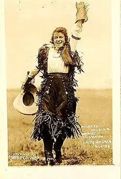 Chrisman was in Kansas City, Missouri, to attend the 1916 American Royal livestock show when she was unexpectedly given the chance to compete in the women's bronco championship. The event was almost canceled due to only two women having signed up, Mayme Stroud and Babe Willets.[4][7] To prevent its cancellation, Wild West performer Lucille Mulhall offered her own horse, named White Man, to Chrisman so she can enter as the third contestant. Being her first competition, Chrisman was coached by Mulhall throughout the duration of it. She ultimately finished in second place, with Stroud placing first.[8] Chrisman would begin to compete professionally under the name Mildred Douglas following this event.[4]