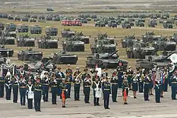 It performs on holidays such as Victory Day (9 May) and Defender of the Fatherland Day (23 February).[3] Over the years, the band has performed throughout the Far East: visited cities like Sakhalin and Kamchatka, in Primorye. The band participated in the First International Festival of Wind Orchestras in Beijing in 1995 and the International Festival of Military Orchestras in Wonju in 2004 and 2011.[4] It has also participated in the Spasskaya Tower Military Music Festival and Tattoo.[5] Since 2012, it has opened the Amur Waves International Military Bands Festival.[6] The band is a laureate of many international competitions and festivals both abroad and in Russia. In 1981, the band was awarded the title "Laureate of the Khabarovsk Komsomol Prize". In September 2019, it took part in a review of military bands in Moscow front of Major General Timofey Mayakin as well as an exhibition on Red Square.[7] The creative achievements of the band were marked with certificates of honor from the leadership of the Khabarovsk Territory, the Minister of Defense and the district commander. The band currently numbers more than fifty performers.[8][9]