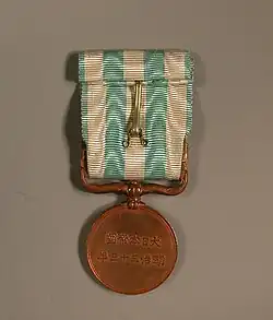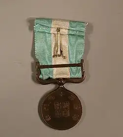 The China Incident Medal (支那事変従軍記章, Sina jihen jūgun kishō) medal was created by Imperial Edit No. 496 on July 27, 1939;[10] and was awarded for service in China at any time from the 12th through the 20th years of the Shōwa period -- Shōwa 12-20 (1937–1945).[11] An amendment was promulgated by Imperial Edict No. 418 in 1944; and the decoration was abolished in 1946 by government ordinance No. 177.[10]
