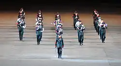 During the 17th and 18th centuries, soldiers marched to the beat of the drum from the day they were recruited in their localities. Drummers, many of them teenagers by the time they were recruited, were also responsible for punishing soldiers who were sentenced to be flogged with whips. The average age of the 304 drummers at Waterloo was 25, with about 10% being boys under 16.[4] The Artillery Band, which were mere "drumme and phifes" for close to 200 years until 1762, was made 'official' that year. Regimental bands in the Foot Guards were first formed between 1783 and 1785.[5] The 1st Foot Guards Band was known as the Duke of York's Band and the 3rd Foot Guards band was known as the Duke of Gloucester's Band.[6] In 1854, during the Crimean War, a parade in Scutari (nowadays Turkey), to celebrate the Queen Victoria's birthday was held, during which twenty British Army bands performed the national anthem. As a result of the bands playing God Save the Queen in different instrumentations and key signatures, the Royal Military School of Music was established that year as the primary training school for all musicians of the army's military bands.[7] In the corps of drums of the line infantry units, while fifes and drums had been played for centuries, beginning in the 1850s bugles began to be adopted in such formations. Until 1837, Army bands sported the Turkish crescent as part of the band percussion section, a tradition introduced from the Ottoman Empire and its military bands in the 18th century.