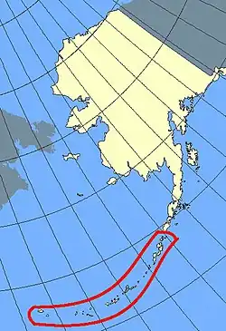 In 1853, prior to the purchase of Alaska by the United States, the United States Navy sent the USS Fenimore Cooper to the Aleutian Islands with the aim of locating potential harbors and find coal deposits. No coal deposits were found.[1] In 1867, the United States purchased Alaska from the Russian Empire.[2] By 1869, a number of military posts had been established by the Government of the United States, although the Aleutian Islands did not receive such a post, with the nearest post being located on Kodiak Island.[3] The United States Army made the decision to leave the exploration of the Aleutians to the United States Navy, and the latter showed little interest in doing so.[1] The Aleutian Islands played a small role in the ongoing sealing dispute between the United Kingdom and the United States, which later culminated in the Bering Sea Arbitration. In 1888, following what the United States Government saw as an infringement on the nation's sovereignty by Canadian and Japanese sealers, the United States Navy sent a number of its ships to Unalaska to police the foreign sealers. By 1891, an accord had been reached between the United Kingdom and the United States, and for some time a number of British and American vessels remained in Unalaska to enforce the deal.[4]