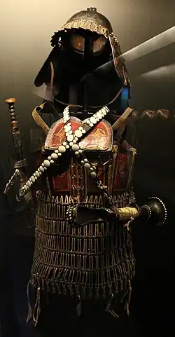 Infantry armour became more common in the Tang era and roughly 60 percent of active soldiers were equipped with armour of some kind.[10] Armour could be manufactured natively or captured as a result of war. For instance 10,000 suits of iron armour were captured during the Goguryeo–Tang War.[20] In the early Tang period when the fubing system was still active, soldiers were supposed to supply themselves with clothing and weapons at the outset of a campaign.[4] However, after the fubing system was replaced with permanent soldiers known as jian'er in the late 7th century, the Tang government began supplying them themselves. Armour and mounts, including pack animals, were supplied by the state through state funds, and thus considered state property. Private ownership of military equipment such as horse armour, long lances, and crossbows was prohibited. Possession was taken as intent of rebellion or treason.[21] The army staff kept track of armour and weapons with detailed records of items issued. If a deficiency was discovered, the corresponding soldier was ordered to pay restitution.[22] The state also provided clothing and rations for border garrisons and expeditionary armies. Soldiers not on active duty were expected to pay for themselves, although "professional" soldiers were given tax exemptions.[23] Officers, however, were permanently employed.[2]