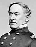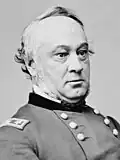 When the war began, the American standing army or "Regular army" consisted of only 1080 commissioned officers and 15,000 enlisted men.[4] Although 142 regular officers became Union generals during the war, most remained "frozen" in their regular units. That stated, most of the major Union wartime commanders had previous regular army experience.[5] Over the course of the war, the Commanding General of the United States Army was, in order of service, Winfield Scott, George B. McClellan, Henry Halleck, and finally, Ulysses S. Grant.