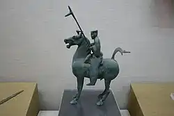 Single mounting stirrups were used, but full double stirrups didn't appear until the later Jin dynasty (266–420).[30]