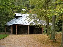 The farm was conceived as a romantic hut with a straw roof and a wide canopy supported by the stumps of wooden trunks. A birch tree grew through the roof, and a bell was installed on the ridge to call the cattle. The smaller half of the building was actually the cowshed;[1] the stalls were designed for 6 cows.[3] The second half was divided into three rooms — two for milk storage, with a stone floor,[1] and covered with tiles made at the Smirnov factory.[4] The third room was a luxurious hall with elegant furniture and expensive porcelain.[1] Maria Feodorovna and her ladies-in-waiting, following the fashion, sometimes engaged in "milking," for which the cows were specially prepared and washed each time.[3]