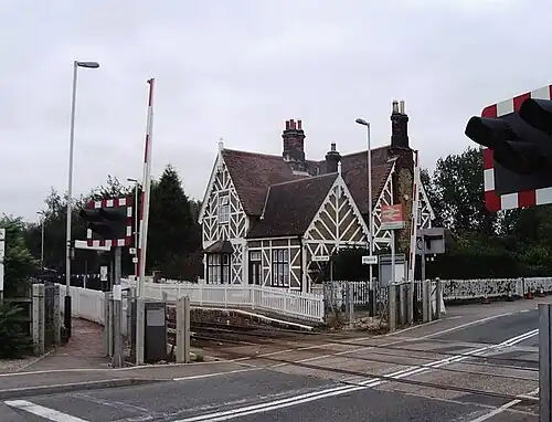 First opened in 1846 by the Bedford Railway, the station was originally named "Marston", but changed to "Ampthill (Marston)" in 1850 after the nearby village. The opening of a second and more conveniently sited Ampthill station by the Midland Railway in 1868 on its Midland Main Line gave rise to confusion which was only resolved in 1877 when the original Ampthill station was renamed "Millbrook for Ampthill". The station is the fourth and final on the Marston Vale Line to be built in a half-timbered Gothic Revival style that had been insisted upon by the 7th Duke of Bedford for stations situated in the vicinity of the Woburn Estate. The two station platforms are east of a level crossing.[4]
